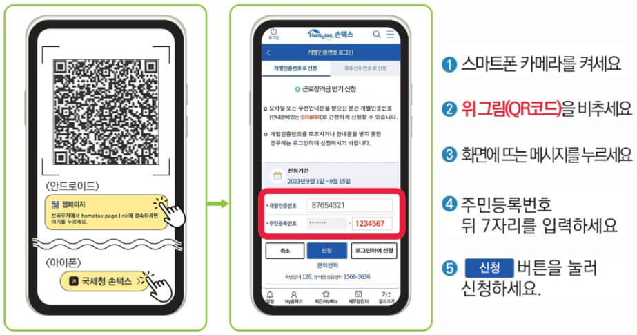 ▶ 안내문에 나와있는 QR코드 스캔 >> 홈택스 모바일앱으로 자동 이동 >> 주민번호 7자리 입력 >> 신청