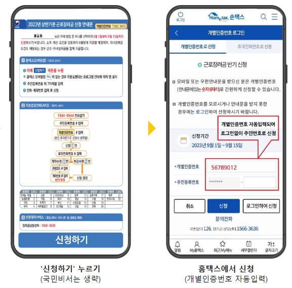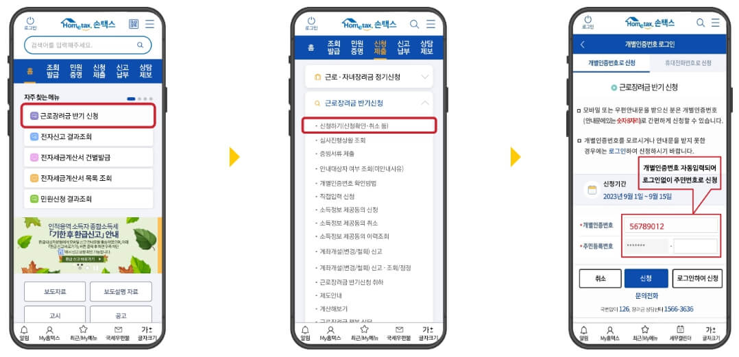 모바일 홈택스앱 >> 근로장려금 반기신청 >> 신청하기 >> 주민번호 7자리 및 개별인증번호 입력 >> 신청