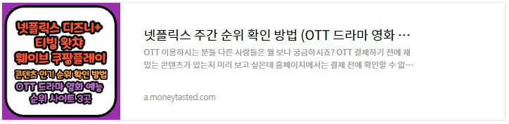 ▶ 넷플릭스뿐만 아니라 티빙, 쿠팡플레이, 웨이브, 디즈니플러스, 왓챠, 박스오피스 OTT 플랫폼의 드라마, 영화 인기 순위를 확인하는 방법은 아래 글을 참고해 주시길 바랍니다.
