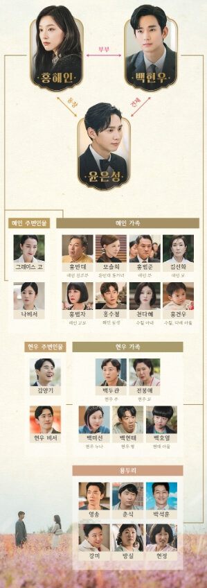 ✅ 등장인물: 백현우 (김수현), 홍해인 (김지원), 윤은성 (박성훈), 홍수철 (곽동연), 천다혜 (이주빈), 홍만대 (김갑수), 모슬희 (이미숙), 홍범준 (정진영), 김선화 (나영희), 홍범자 (김정난), 백두관 (전배수), 전봉애 (황영희), 백현태 (김도현), 백미선 (장윤주)