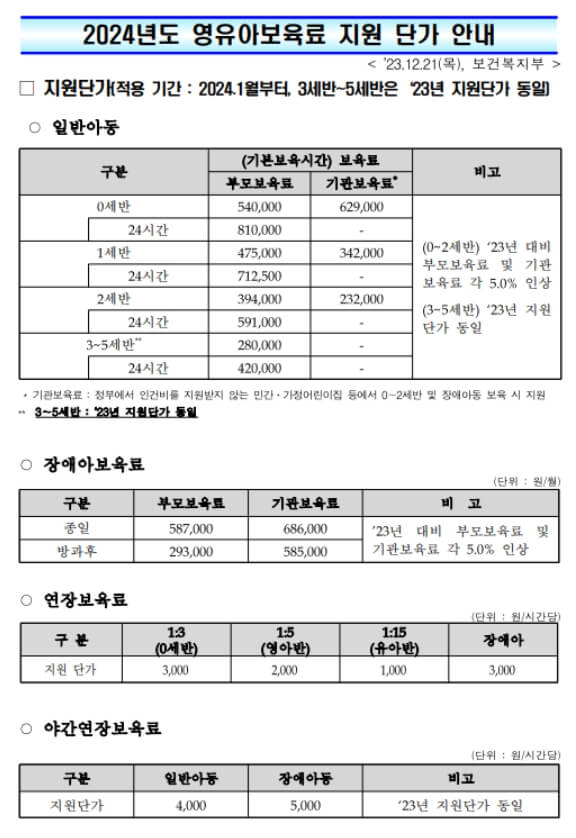 ※ 장애아 보육료는 위의 2024년도 영유아 보육료 지원단가를 참고해 주세요.