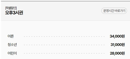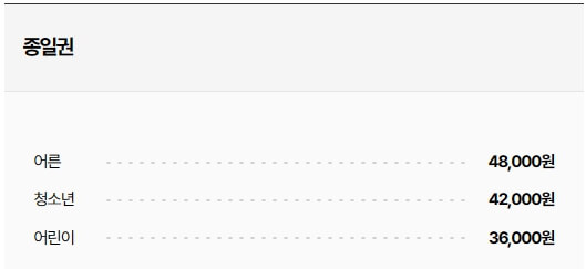 이용요금: 종일권 50,000원, 오후권 35,000원 (오후 2시 이후), 36개월 미만 무료