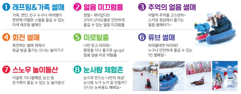튜브 썰매존, 봅슬레이 썰매존, 어린이 썰매존, 스노우 놀이터, 푸드존 등이 준비되어 있습니다.