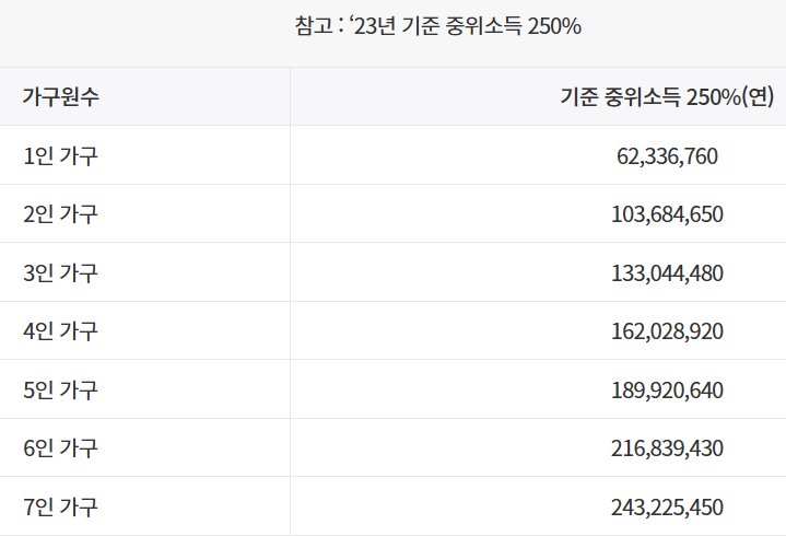 - 가구원 수에 따른 기준 중위소득 250% 이하