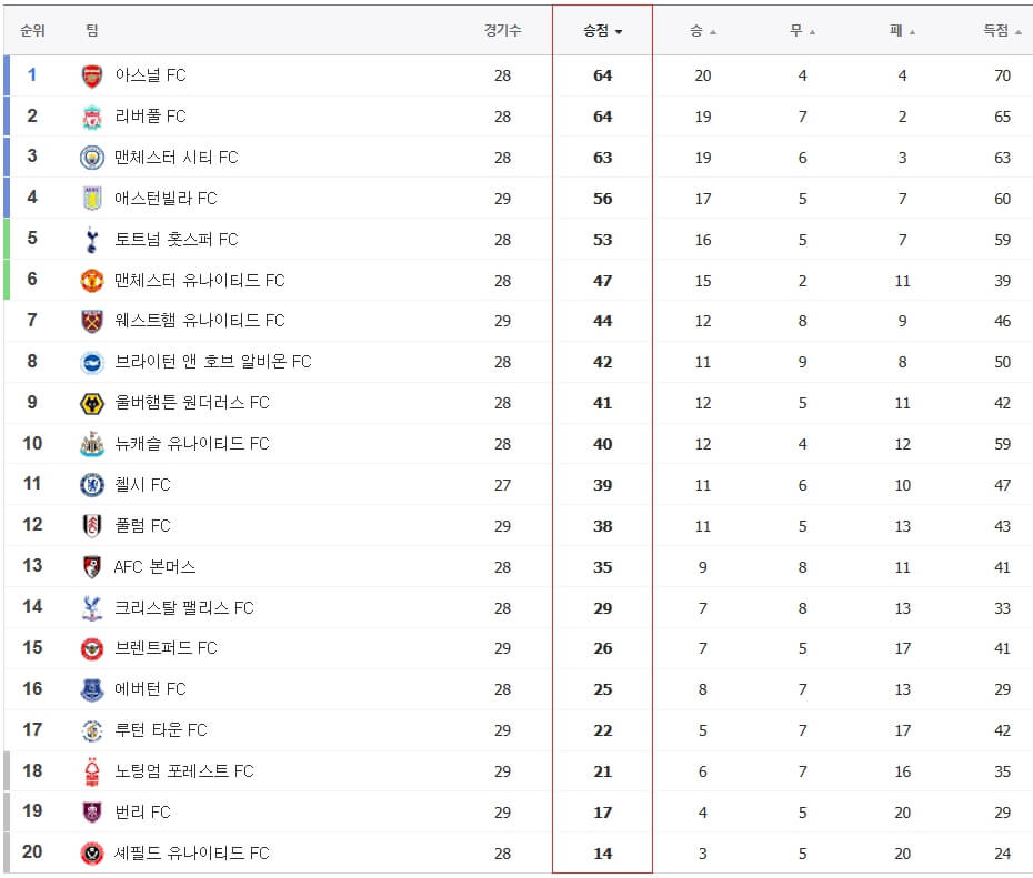 현재 EPL 순위는 아래와 같습니다. 1위 아스널, 2위 리버풀, 3위 맨시티, 4위 애스턴빌라, 5위 토트넘 등으로 1, 2, 3위 경쟁과 4, 5위 경쟁이 치열합니다.