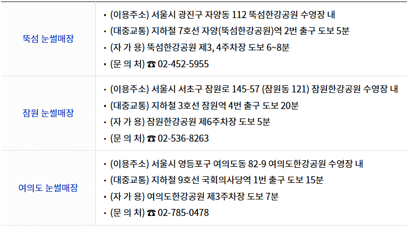 - 장소: 뚝섬, 여의도, 잠원 한강공원 수영장부지