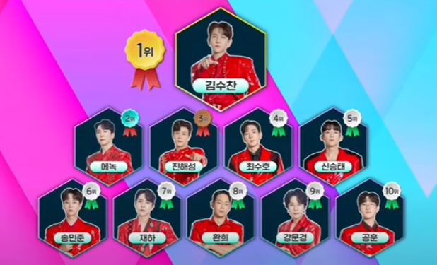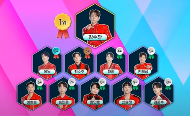 1위 김수찬, 2위 에녹, 3위 최수호, 4위 재하, 5위 진해성, 6위 이현승, 7위 송민준, 8위 황민호, 9위 신승태, 10위 김준수