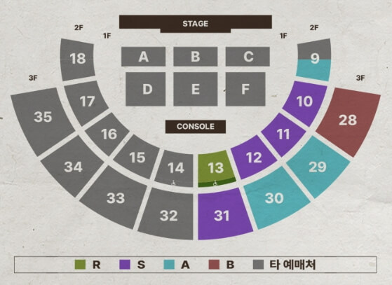 1층 A~F 구역은 평지이며, 2층 및 3층은 계단식 좌석입니다.