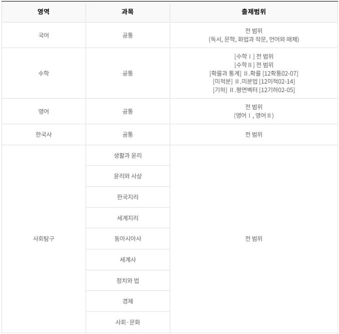 - 과목: 국어, 수학, 영어, 한국사, 사회탐구, 과학탐구, 직업탐구, 제2외국어, 한문