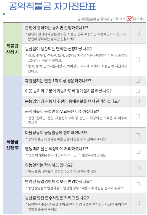 공익직불금이란 농업과 농촌의 안전한 먹거리를 제공하는 공익적 가치를 보전하기 위해 국가에서 매년 농민들에게 보조금을 지원하는 제도입니다. 아래에서 공익직불금 신청자격, 신청기간/방법, 의무교육, 지급시기 등에 대해서 확인하실 수 있습니다.