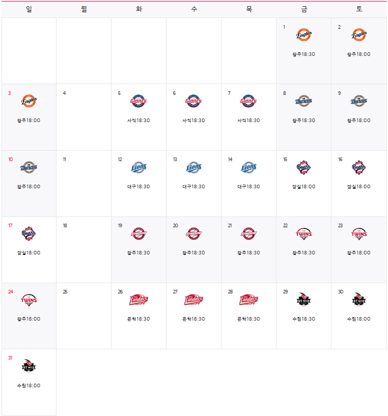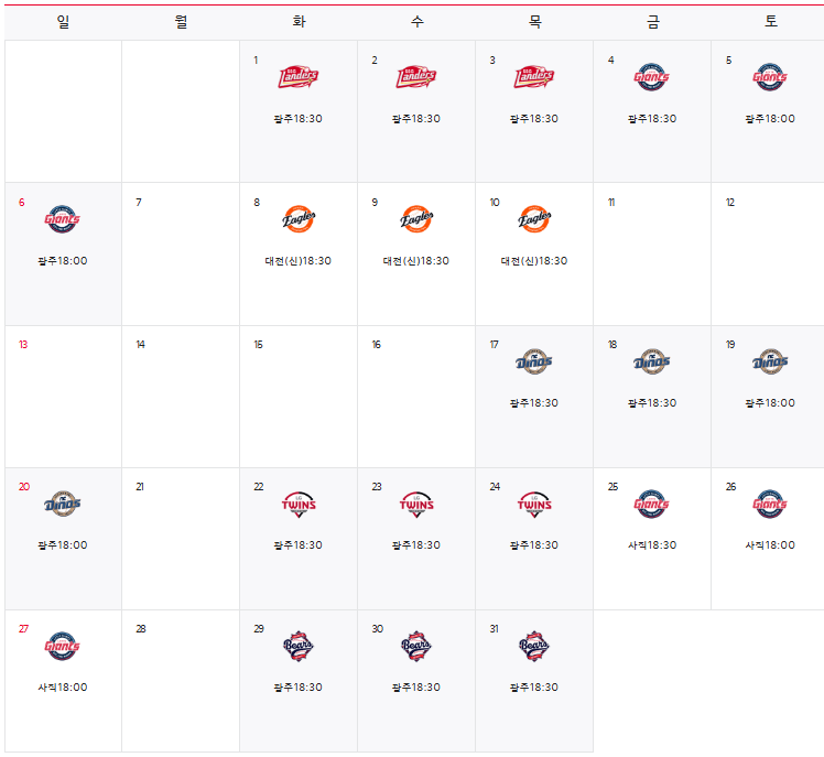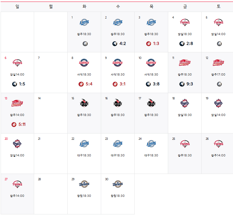 아래에서 4월, 5월, 6월, 7월, 8월의 월별 경기 일정표를 보실 수 있습니다. 일정표를 누르면 일자별 상대팀, 경기시간, 경기장을 크게 보실 수 있습니다.