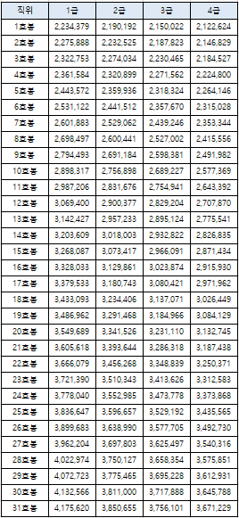 3%의 인상률을 반영한 2025년 사회복지사 (및 사회복지시설 종사자) 기본급 호봉표는 아래와 같습니다. 이는 보건복지부에서 기본급으로 권고하는 금액입니다.