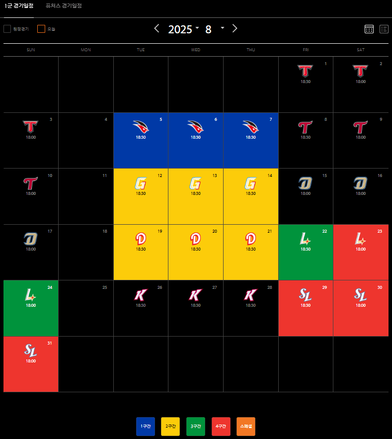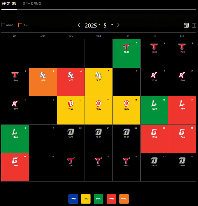 일정표의 색은 1구간 ~ 4구간, 스페셜 구간을 뜻하며 이에 따라 티켓의 가격이 달라집니다. 숙박 예약할 때 성수기 요금이 비싼 것과 비슷하다고 생각하시면 됩니다. 아래 일정표를 누르면 일자별 상대팀과 경기시간을 크게 보실 수 있습니다.