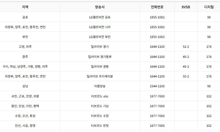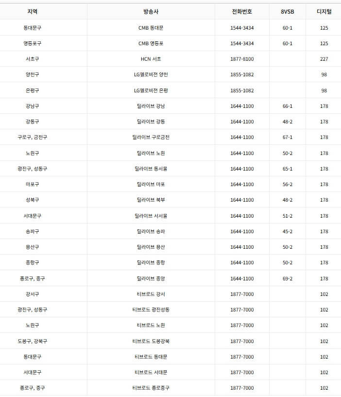 그 외 지역별 (케이블 방송사별) 채널번호는 위의 채널번호 바로가기로 가시면 조회하실 수 있습니다.