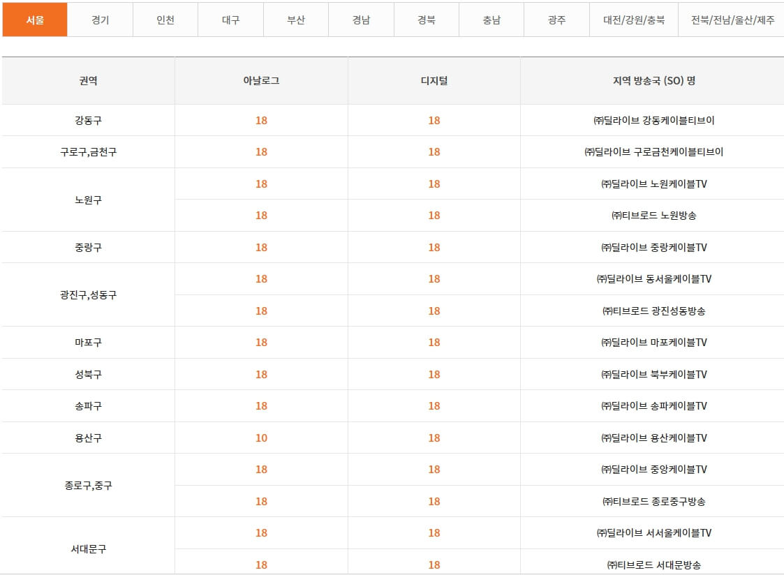 - 서울 지역: 딜라이브, 티브로드, CJ헬로, 현대HCN, 씨엠비 (CMB)