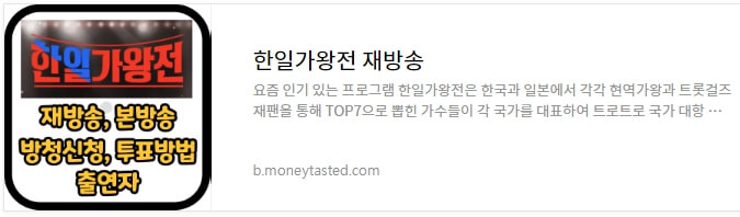 요즘 MBN방송사에서 가장 화제가 되고 있는 프로그램은 한일가왕전이죠. 한국과 일본이 노래로 국가대항전을 한다는 신선한 주제와 실력있는 가수들의 활약으로 인기가 많습니다. 한일가왕전 프로그램의 본방송, 재방송 편성표, 투표방법, 방청신청방법, 출연자 등의 정보가 궁금하신 분들은 아래 글을 참고해 주시기 바랍니다.